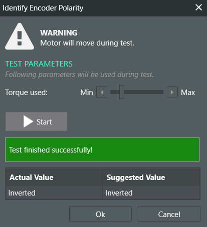 - Once all the feedback devices have been properly configured, it is time to calibrate the commutation. Starting from the setting that we set a few steps before, the only remaining thing to do is to calibrate the initial commutation angle by using the Calibrate button. Start by using a small amount of torque and keep increasing it until you get enough movement to get the test finished successfully.