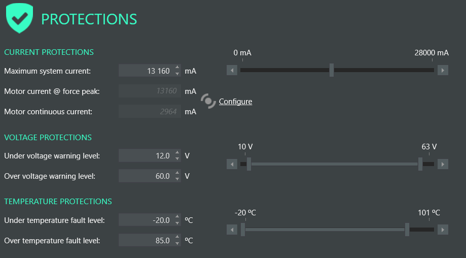 - After having set the Limits correctly, make sure that the Protections parameters are set up correctly as well. Adjust the voltage range to your application's and make sure that the maximum system current is equal to or higher than the peak current.