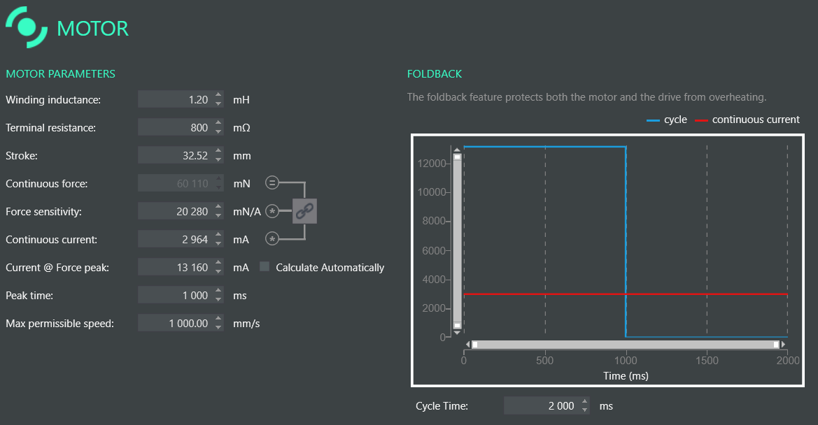 - Now go to the Motor window and introduce all the parameters from the datasheet besides the stroke. In order to properly set the stroke, you need to understand that the value that MotionLab interprets is the stroke that the brushed motor would have if you were to read the full range of the analog signal feedback. This full range is 4096 counts, and as you can see in our example, this is not our case so some scaling needs to be done. In this case, the total real stroke is 25 mm so in MotionLab you should input the following value: