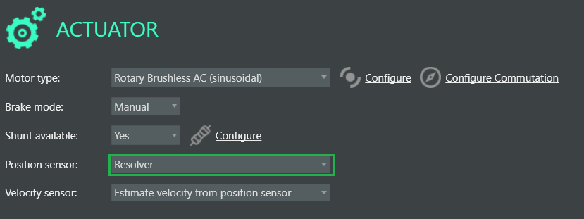 - Once you have connected to the drive, go to the Actuator window and set the right parameters for the Motor Type, Position sensor and Velocity sensor. Your window should look like the following: