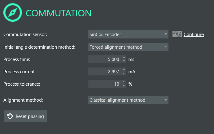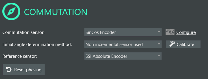 - After having configured the sin-cos encoder correctly, it is time to calibrate the commutation in the Commutation window. When attempting to do this, we usually find 2 different cases: