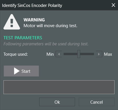 - The next step is to configure the encoder feedback in the Sincos Encoder window. At first, this includes setting the Sensor resolution, the Multiplier factor and the Noise filter. The first one you can get directly by taking a look at the datasheet of the encoder, the second one you decide depending on the total resolution that you want and the third on you can determine it through the checking procedure that is explained in the article How to know if the feedback device is working properly. Finally, the Polarity can be determined either with the Auto identify tool or through the manual procedure explained in the article How to calibrate the polarity of your feedback device manually. An example of how to do it with the Auto identify tool is shown in the following pictures: